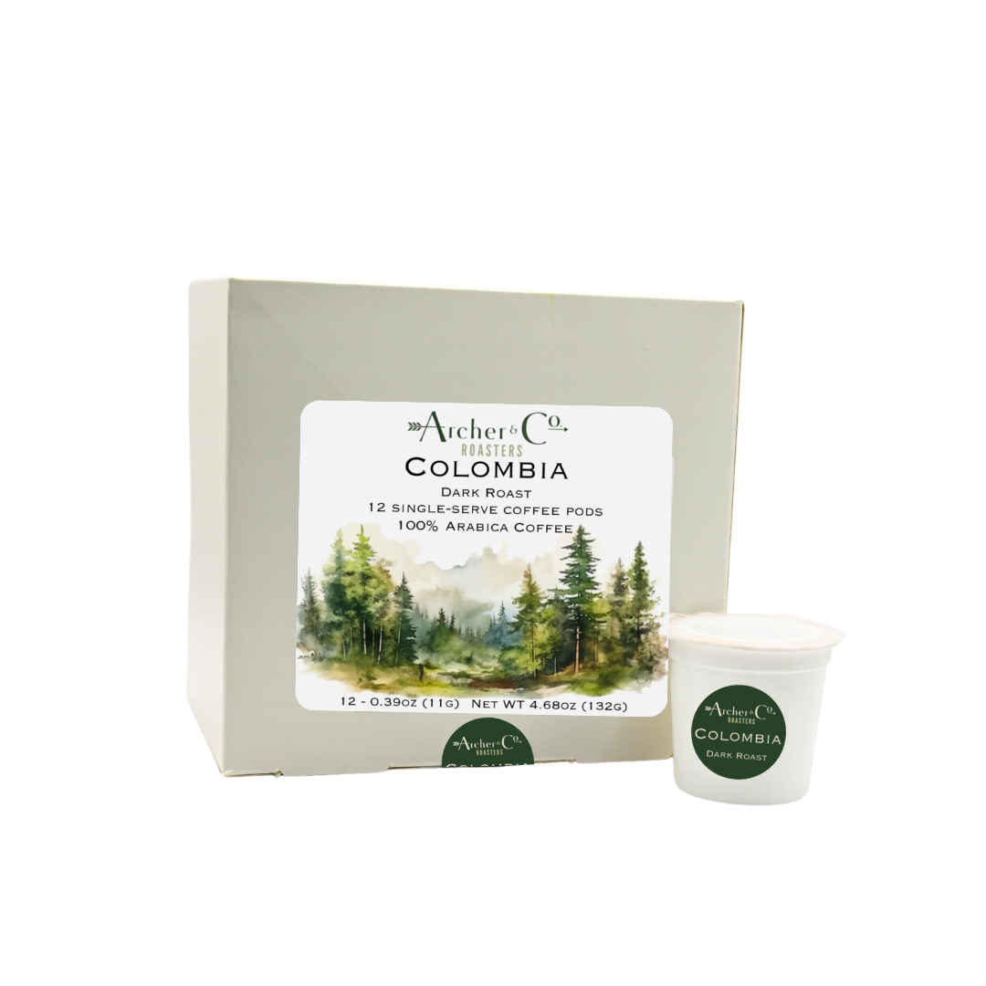 12 count box of Colombia single serve pods. Dark roast with notes of cocoa with mellow pecan and cooked coffee cherry flavors. Tart malic acidity and mild candy-like sweetness. Compatible with Keurig.