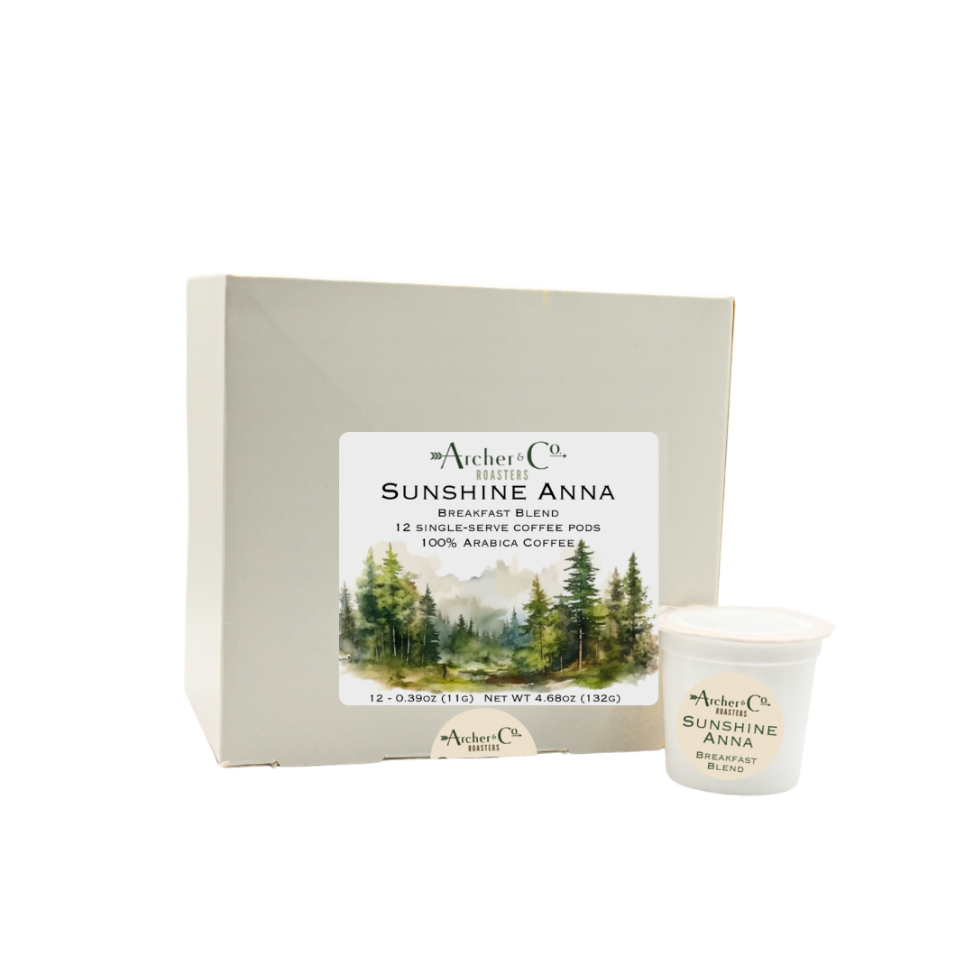 12 count box of Sunshine Anna Breakfast Blend single serve pods. Sunshine Anna Breakfast Blend is a great way to start your day. A blend of Central, South American, and Ethiopian beans to yield a smooth cup of coffee, no matter what extraction method you prefer.